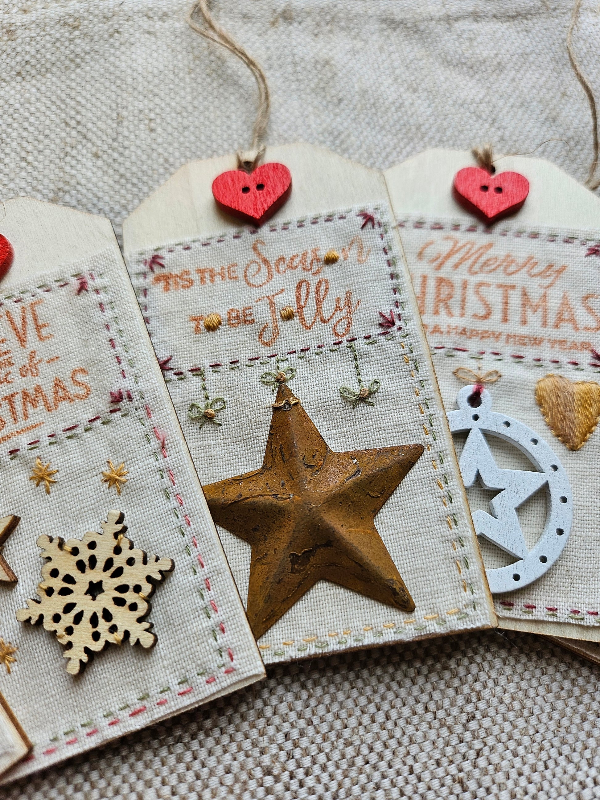 Set of 5 gorgeous wooden Christmas tags...your kit includes 5 wooden tag bases, pre-stamped fabric tag stitchy and interfacing, stitchery pattern, all buttons and threads and full instructions. Please note there may be very minor differences to some of the button designs.