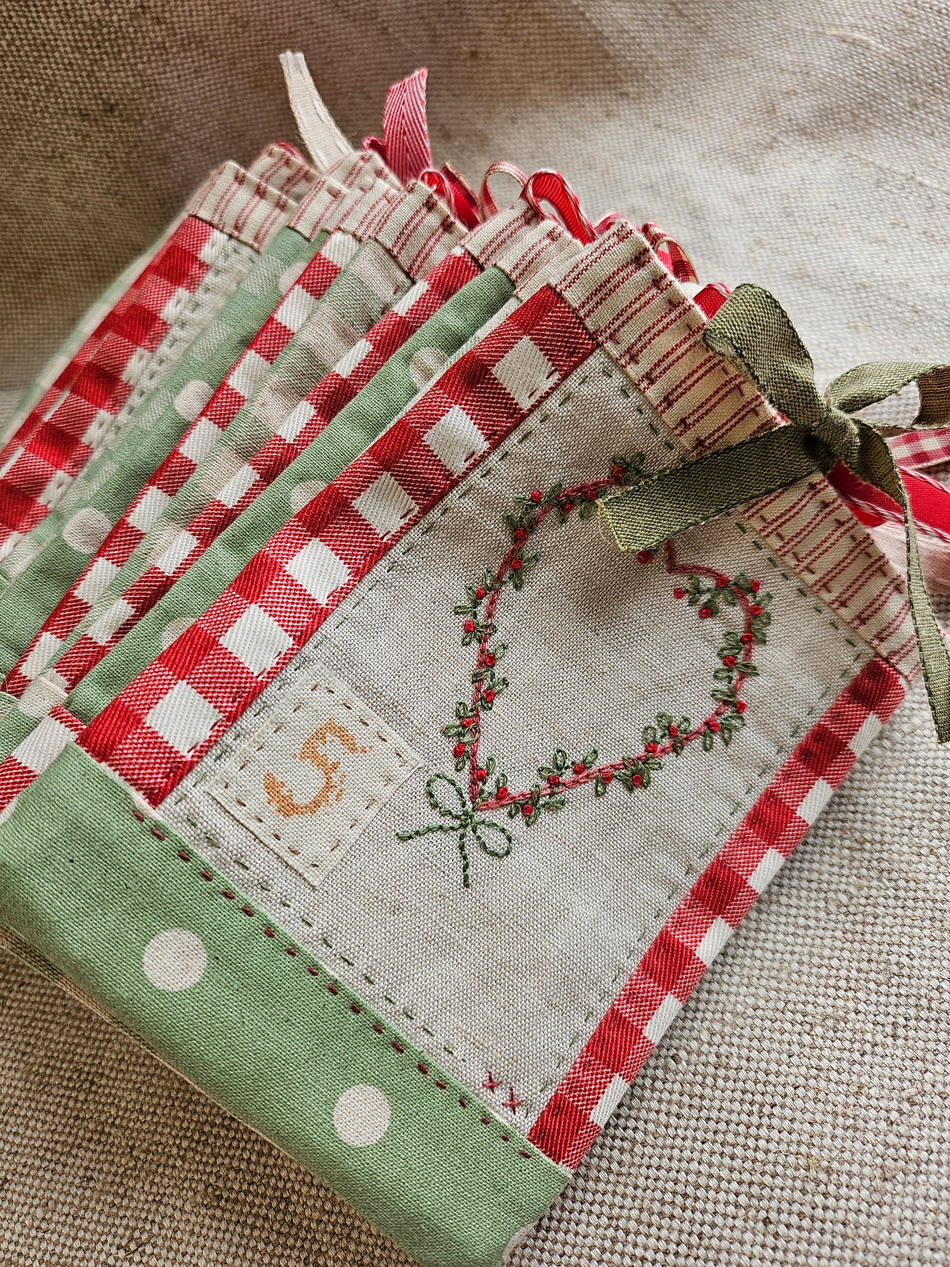 This is a mystery advent calendar project of the month. The subscription will run for 5 months. For each of the first 4 months you will receive six stitchy patterns for six days of the calendar, in the 5th month you will receive instructions for making up the designs into 24 "containers" and a large "container" to hold all 24. The project will involve simple embroidery stitches for the first 4 months, a tiny little bit of applique for fun, and some basic sewing skills for the 5th month.